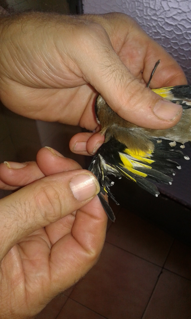 mirar chicos este es el jilguero tenia bastantes alas yo crei que tenia menos eso si tenia en la punta quesangre le estaba creciendo otra encima de una quebrada y tres quebradas mas pobrecito se las hemos arrancado mi padre y llo haora luego ire a comprarle tavernil muda creis que hay otro mejor?